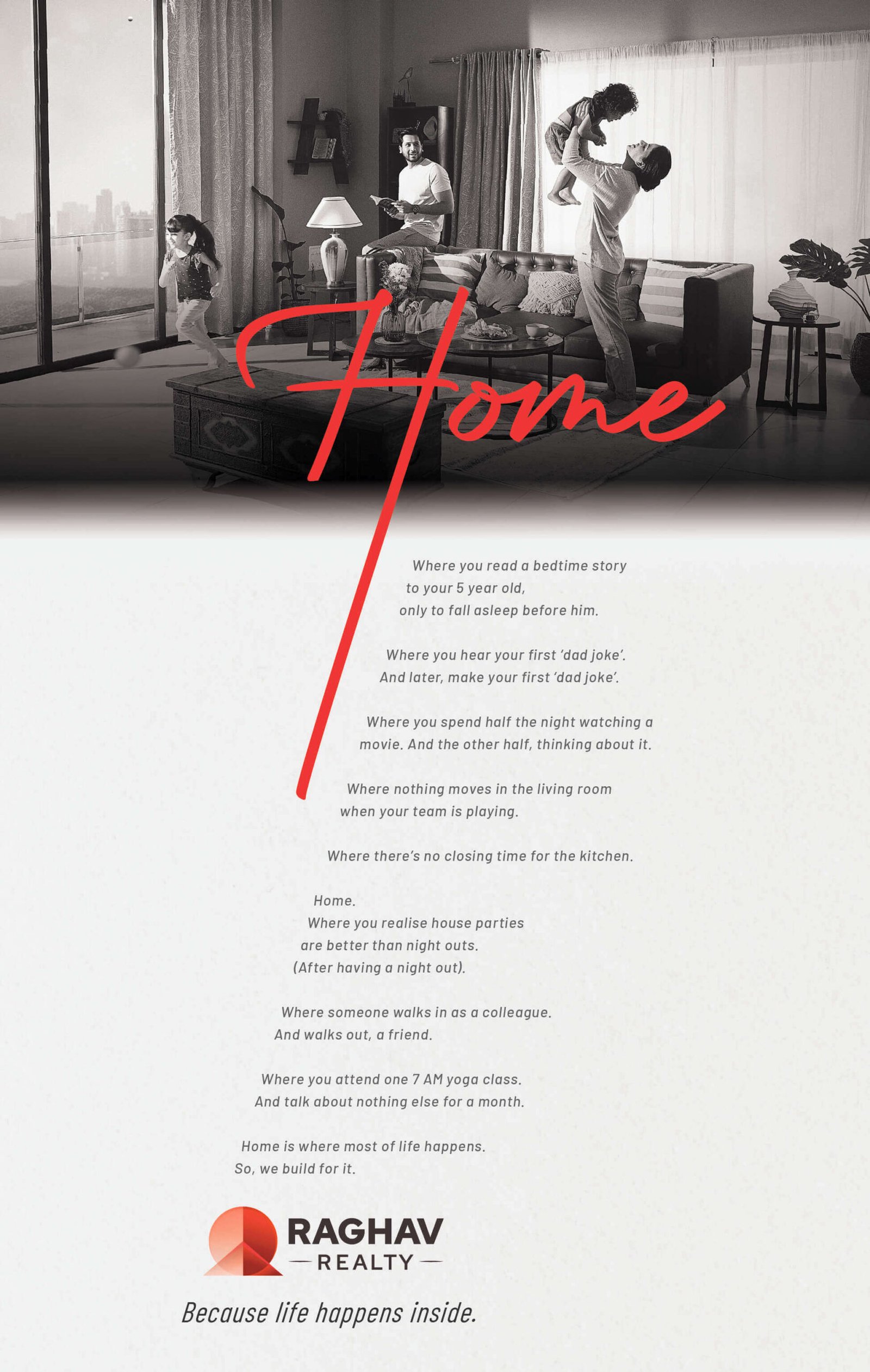With Raghav Realty, we shifted the focus inward. Home isn’t just about what’s outside your window — it’s about the small, everyday moments inside. Morning coffee in your quiet corner. Laughter echoing from a spacious kitchen. A place where real life unfolds, naturally.